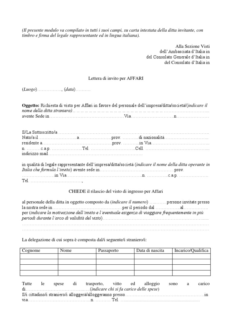 DOC (Il presente modulo va compilato in tutti i suoi campi, su carta ... Lettera di invito per AFFARI (Facsimile) Oggetto: Richiesta di visto per Affari in favore del/la Sig./Sig.ra Il/La Sottoscritto/a Nato/a il a prov. di nazionalità residente a prov. in Via n. C.A.P. Tel. indirizzo mail in qualità di dell'impresa/ditta/società avente sede in prov. in Via n. C.A.P. Tel. indirizzo mail